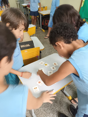 Hoje trabalhamos a consciência fonológica por meio do Jogo das Rimas, do projeto Trilhas. Diversão e aprendizado.